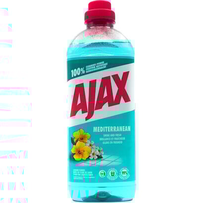 AJAX Mediterranean Lagoon Flower to wszechstronny płyn czyszczący do użytku domowego, który łączy skuteczne usuwanie zabrudzeń z przyjemnym, relaksującym zapachem inspirowanym śródziemnomorską laguną. Idealnie nadaje się do czyszczenia podłóg, blatów, kafelków i innych powierzchni zmywalnych.