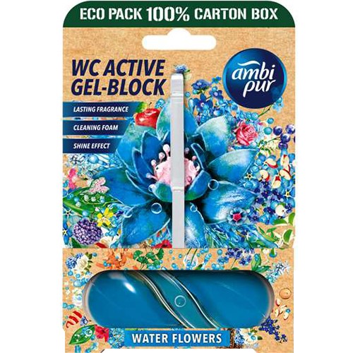 Opis produktu Ambi Pur Wc Active Gel-Block Water Flowers zawieszka do WC zapewnia czystość i świeżość w toalecie przez cały dzień.