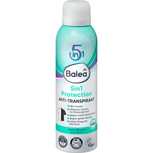 Balea Deodorant 5in1 Protection 200ml – Skuteczny dezodorant do ciała o świeżym owocowo-kwiatowym zapachu. Zapewnia świeżość i ochronę przez 48 godzin. Antyperspirant w sprayu Balea 5w1 Protection zapewnia bezpieczeństwo i wszechstronne uczucie zadbanej skóry pod pachami. Spray nie pozostawia białych śladów ani żółtych plam na odzieży. Skuteczna ochrona utrzymuje się aż do 48 godzin. Dzięki temu dezodorant jest idealnym towarzyszem na cały dzień.