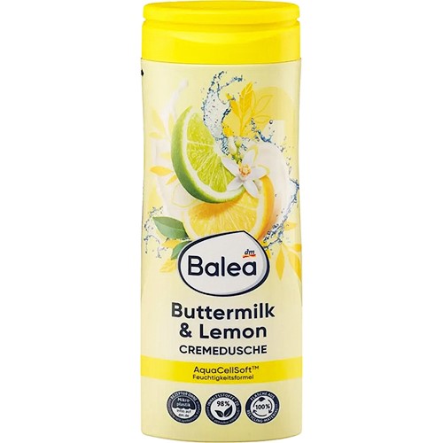Balea Cream Shower Buttermilk & Lemon zapewnia skórze uczucie miękkości i pieści zmysły inspirującym zapachem – każdego dnia. Łagodna formuła nawilżająca z AquaCellSoft sprawia, że skóra staje się miękka i elastyczna, a delikatna formuła pielęgnacyjna z proteinami mleka chroni ją przed wysychaniem i zachowuje naturalną równowagę. Ciesz się owocowo-słodkim zapachem maślanki i cytryny – uwodzi zmysły.