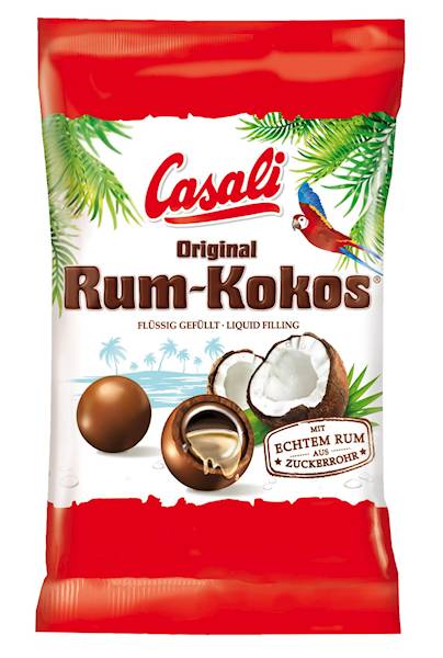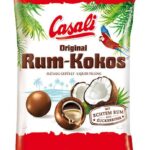 Casali Milk Chocolate Rum Cocos to czekoladowe draże z płynnym rumowym środkiem! W środku znajdziesz również drobne płatki kokosa, a całość oblana jest pyszną mleczną czekoladą. Produkt zawiera alkohol w postaci rumu!