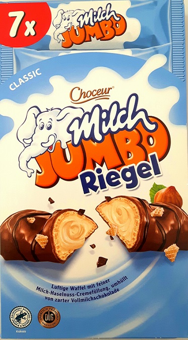 Batoniki Milch Jumbo są to wyśmienite, niemieckie batoniki z nadzieniem mleczno – orzechowym z orzechów laskowych oblane delikatną mleczną czekoladą W opakowaniu znajduje się 7 batoników. Każdy oddzielnie zapakowany. Jumbo Choceur to pyszne batoniki nadziewane kremem o różnych smakach w pysznej, mlecznej czekoladzie.