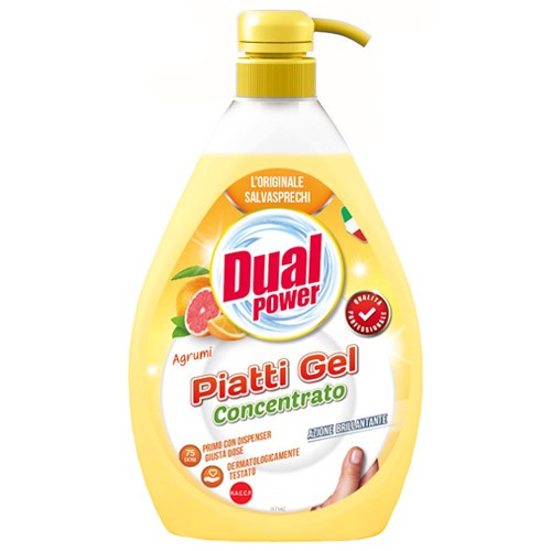 Dual Power Wasching Up Gel Concentrated Lemon to silnie skoncentrowany, WŁOSKI płyn do mycia naczyń w formie żelu o cytrynowym zapachu. Doskonale czyści uporczywe zabrudzenia nawet w zimnej wodzie. Płyn zapewnia świeżość naczyniom w trakcie mycia oraz dzięki wyjątkowemu składowi zabija do 99% bakterii z powierzchni naczyń.