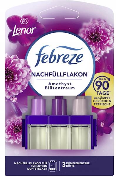 Wkład do wtyczki zapachowej Febreze 3Volution Lenor Amethyst z technologią uwalnia powietrze z uporczywych zapachów, pozostawia lekki zapach świeżo upranego prania Lenor Amethyst do 90 dni (przy stosowaniu 12 godzin dziennie przy najniższym poziomie intensywności). Wtyczka zapachowa automatycznie przełącza się między 3 uzupełniającymi się, wysokiej jakości zapachami co 45 minut, zapewniając ciągłą świeżość.