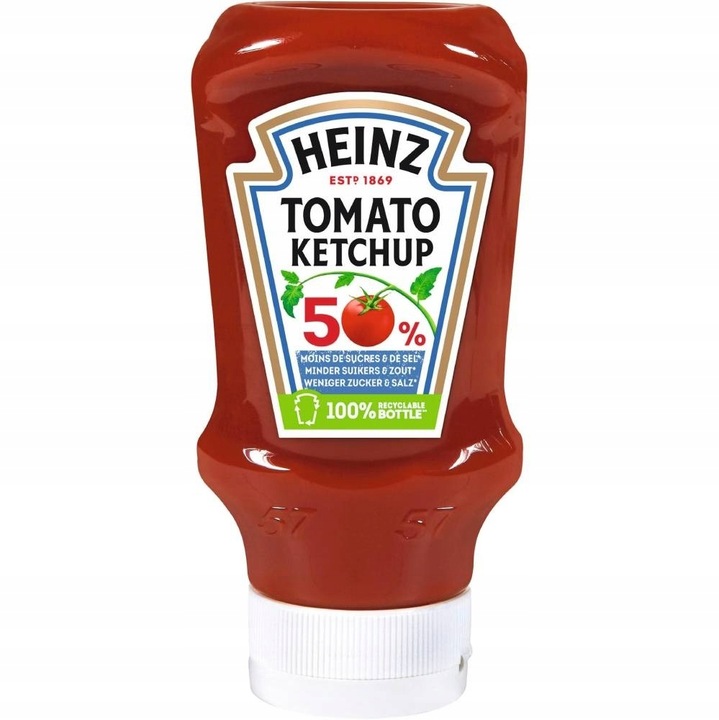 Heinz Tomato Ketchup 50% 500 ml – Oryginalny ketchup z mniejszą zawartością soli i cukru o 50% . Idealny do kanapek, bułek, mięsa, kiełbasek, sosów, pizzy i rożnych dań.