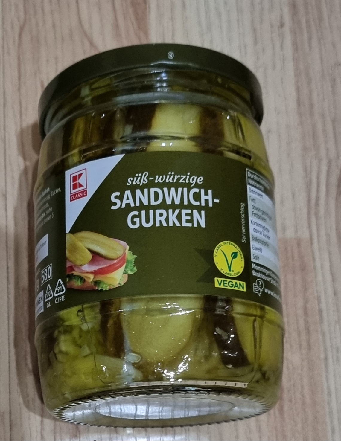 K-Classic Sandwich Gurken to wysokiej jakości ogórki kanapkowe o przyjemnym, słodko-pikantnym smaku. Pokrojone wzdłużne plastry doskonale nadają się do kanapek, burgerów, hot-dogów oraz jako dodatek do sałatek i dań na zimno. Produkt wegański, przygotowany z wyselekcjonowanych ogórków w aromatycznej zalewie przyprawowej.