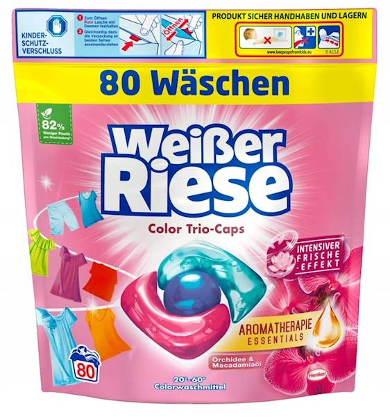 Weiser- Riese Trio-caps Trójkomorowe kapsułki do prania kolorowych tkanin Weißer Riese Aromatherapy Essentials zapewniają wyjątkowe i długotrwałe doznania zapachowe.