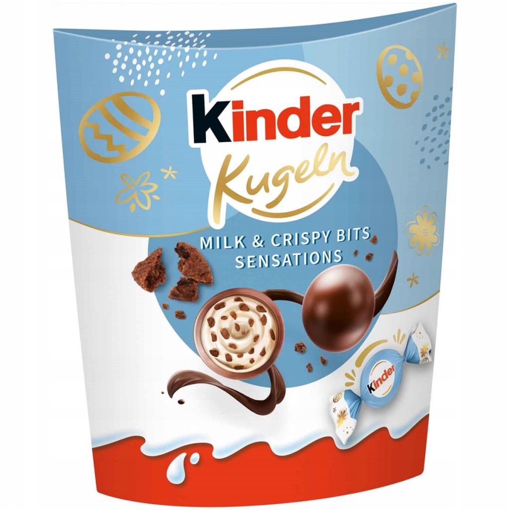 Kinder Kugeln Milk & Crispy Bits to wyjątkowe pralinki w formie kulek z delikatnej mlecznej czekolady, wypełnione kremowym mlecznym nadzieniem i chrupiącymi kawałkami. Idealne połączenie aksamitnej słodyczy i przyjemnej chrupkości sprawia, że trudno się im oprzeć.