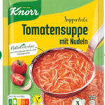 Knorr Tomatensuppe mit Nudeln to aromatyczna zupa pomidorowa z dodatkiem makaronu, przygotowana bez dodatku wzmacniaczy smaku. Charakteryzuje się intensywnym pomidorowym smakiem oraz lekką, przyjemnie zbalansowaną konsystencją. Produkt jest odpowiedni dla diety wegańskiej. Jedno opakowanie wystarcza na 3 porcje zupy (łącznie 750 ml). Idealna jako szybki obiad, lekka kolacja lub rozgrzewający posiłek w kilka minut.