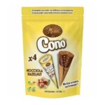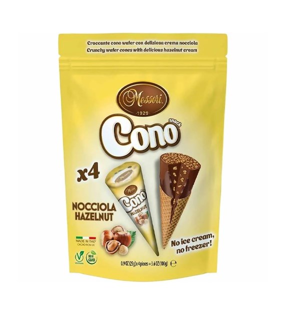 Messori Cono Hazelnut to wafelki nadziewane kremem orzechowym, pakowane po 4 sztuki po 25 g, idealne na słodką przekąskę dla całej rodziny