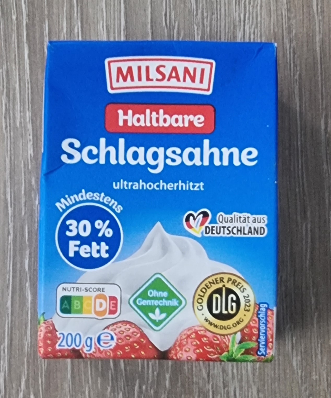 MILSANI Haltbare Schlagsahne 30% to wysokiej jakości śmietanka UHT do ubijania, pochodząca z Niemiec. Idealnie nadaje się do ciast, deserów, kawy oraz wszelkich wypieków. Dzięki zawartości minimum 30% tłuszczu ubija się szybko, tworząc sztywną, kremową i stabilną konsystencję.