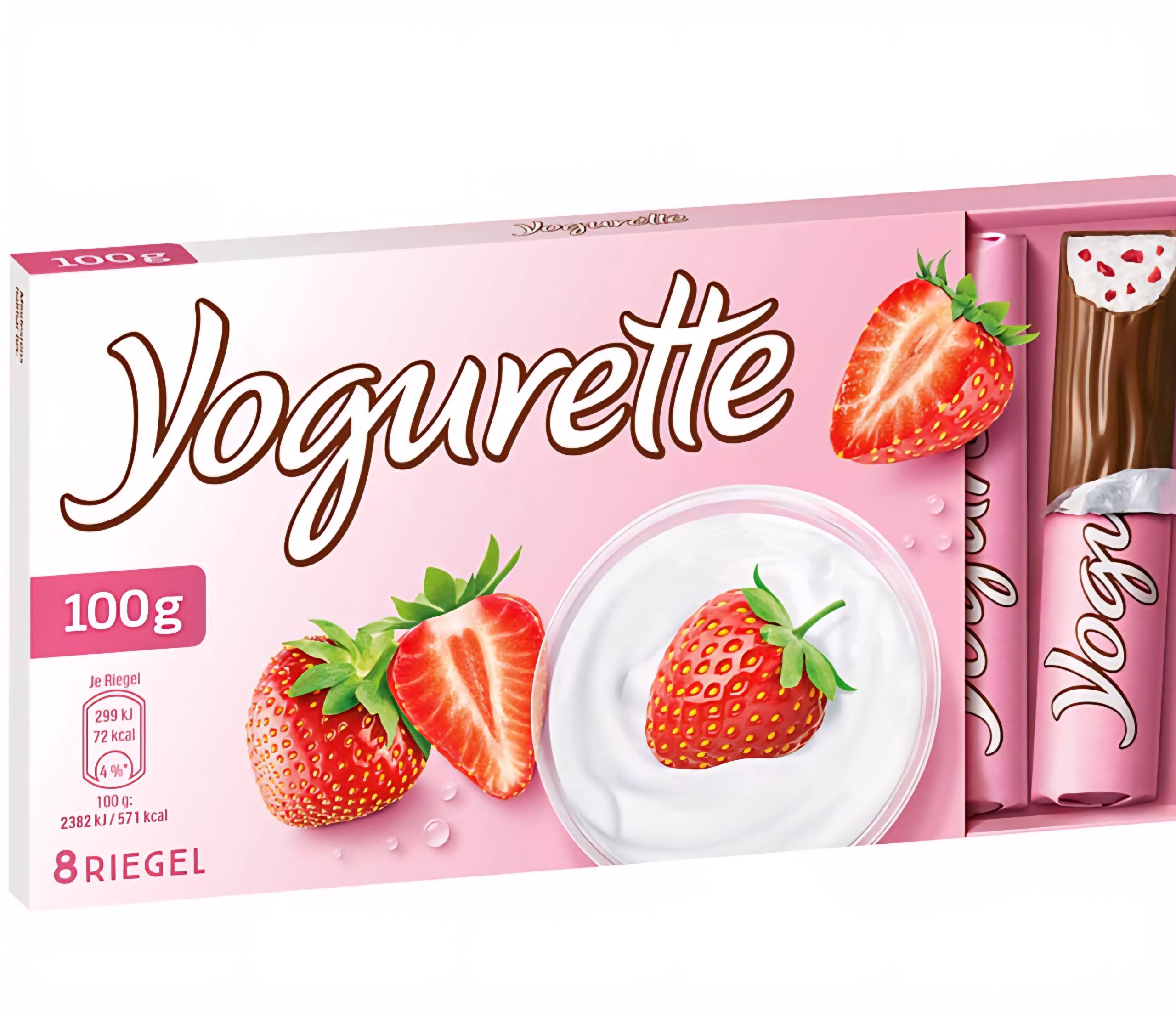 Yogurette charakteryzuje się niewątpliwym aromatycznym smakiem: jogurtowo-truskawkowy – wykończony odrobiną delikatnej mlecznej czekolady. Osiem pojedynczo pakowanych batonów… smakuje jak lekki jogurt!